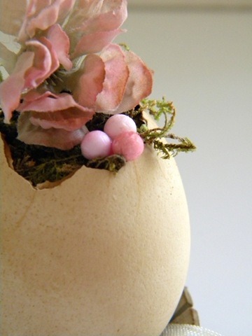 The eggs were gently stuffed with tissue paper and then a layer of moss added to peek over the edges. A pink silk flower and a few pink faux berries gives the neutral eggs a little splash of color.