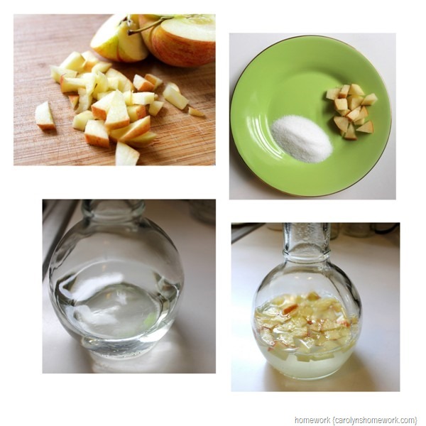 If the fruit flies liked the apples and vinegar, I could make my own. I decided on the white wine vinegar. After all, I should at least let the fruit flies die happy in a little wine. I chopped up some apples to add to the vinegar. I wasn’t feeling confident so I incorporated ideas from other fruit fly trap recipes, sugar and a drop of dish soap (the soap makes the liquid slippery and harder for them to escape).